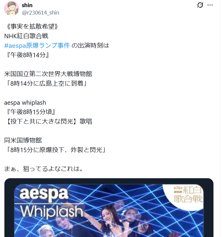aespa紅白出演時間8時15分、原爆投下時刻と重なる歌詞に批判殺到