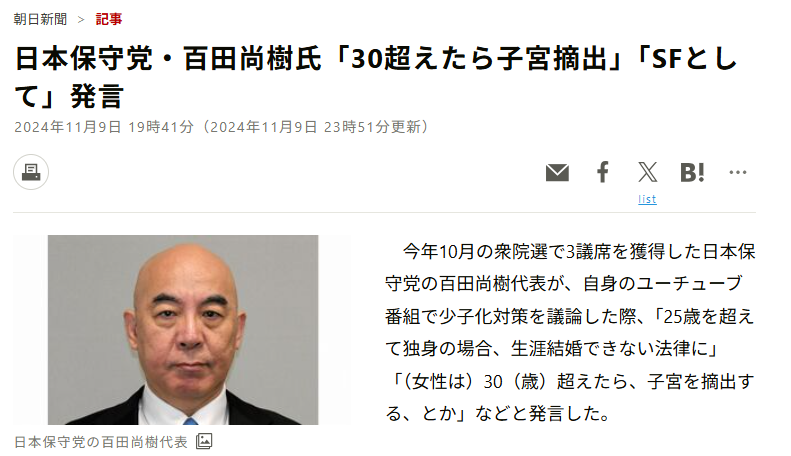 作家で日本保守党の代表を務める百田尚樹参院議員が23日夕、自身のX(旧ツイッター)を更新。