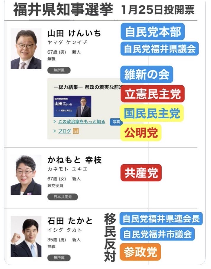 自民支持を受けた山田氏は、日本維新の会、国民民主、公明、立憲民主各党の県組織の推薦、連合福井など700以上の団体からの支持を取り付けた。自民の小林鷹之政調会長らも応援に入り、終盤まで激しく競り合ったが、僅差で及ばなかった。