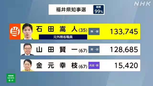 セクハラ問題による前職の辞職に伴う福井県知事選は25日投開票の結果、元外務省職員の無所属新人石田嵩人氏(35)が、前越前市長の無所属新人山田賢一氏(67)=自民支持=ら新人2人を破り、初当選した。全国知事会によると、石田氏は現職知事として全国最年少となる。自民党支持に加え、各党の県組織や団体から推薦を得て組織戦を展開した山田氏との激しい保守分裂選を制した