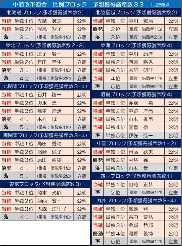 衆院選が27日公示され、立憲民主党と公明党の前議員らが結集した新党「中道改革連合」の比例代表名簿が公表された。全国11ブロックのすべてで1位に公明党出身者が登載され、近畿ブロックでは上位5人、九州ブロックでは同4人など、公明党出身者28人が優遇されていた。