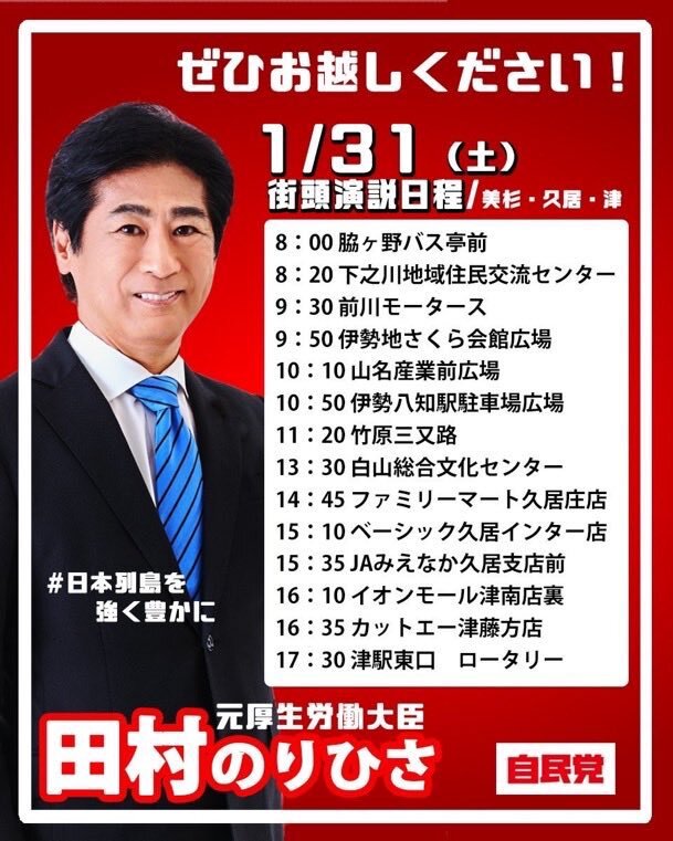 なるほどなぁ、どの候補も疲労困憊になる選挙中盤に田村は、もしかしたら空振りになるかもしれない代役スタンバイのために東京・三重間を往復させられたうえ(当日朝に決断してから呼びつけたのでは物理的に間に合わん)、選挙活動できる最後の日曜日を半日潰されたというわけか