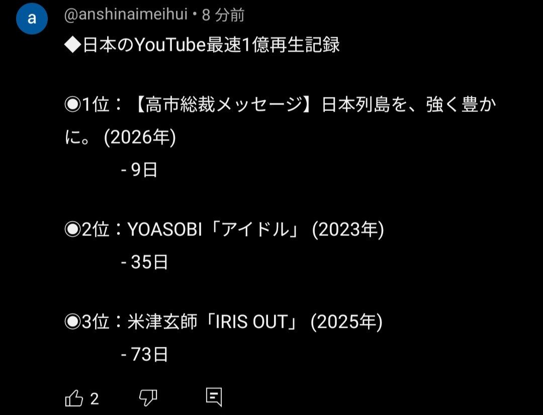 高市の動画は8日で1億再生だから
