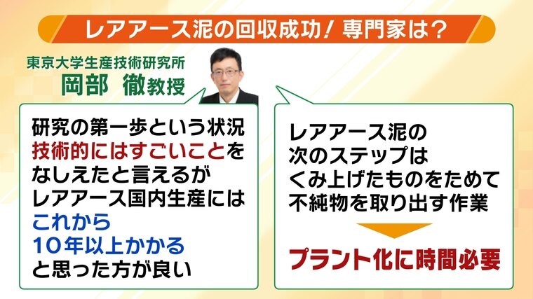 「一定の試験はすでに行っているだろうが、海底から取り出したレアアース泥の中からどのような構成のレアアースが見つかるか、本格的に出してみるまで分からない」。