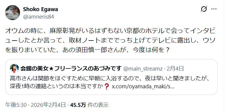 須田さんって、オウム事件の時に、教祖の麻原彰晃こと松本智津夫がいるはずもない京都のホテルで会ったとかって、ありえないことを平然と言って回ってテレビに露出しまくった、あの須田さんですか?
