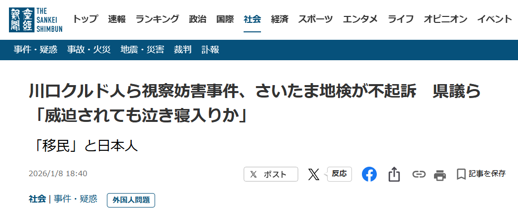 産経新聞:産経ニュース2026/1/8 18:40
