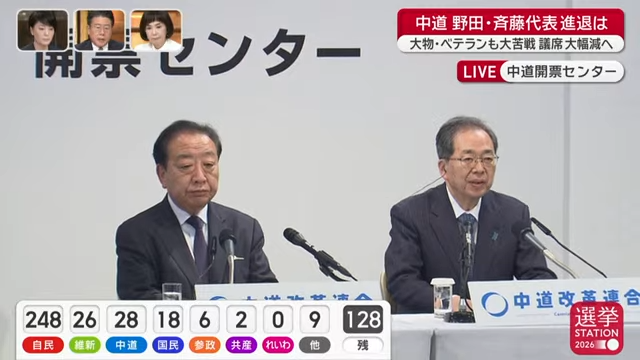 衆院選では、中道改革連合の「大物」候補が相次ぎ敗北した。党執行部では、安住淳共同幹事長が宮城4区、馬淵澄夫共同選対委員長が奈良1区で議席を失った。