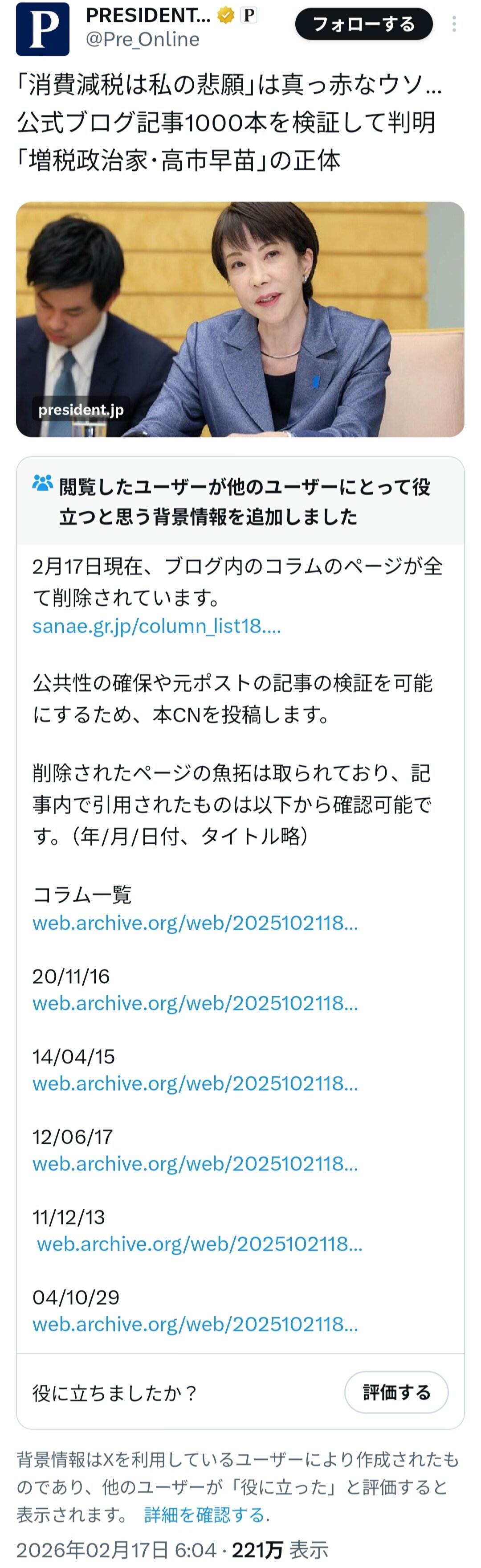 高市早苗首相(自民党総裁)の公式サイトから、これまで書いてきた自身の「コラム」欄が最近までに削除されたか、もしくは一時的に閲覧できなくなっているのではないか、などの指摘がX(旧ツイッター)上などで相次いでいる。