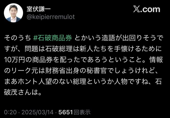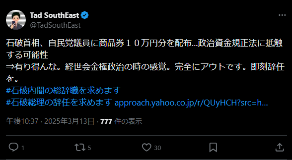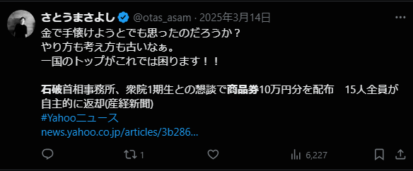石破は自分が1議員のときに批判してた脱法の金券配りだから、どの口で言ってんだと批判された