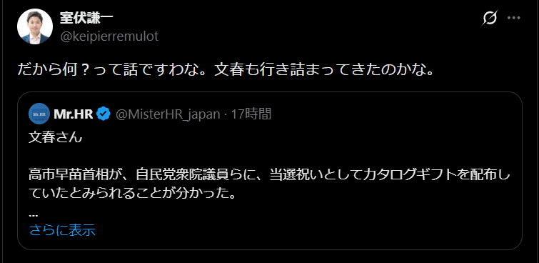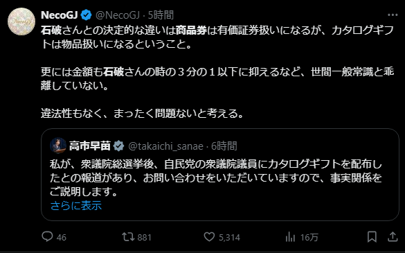 アホが混同しようとしてるし、追及しようとしてる中道小川が高市と同じように若手議員に物品配りまくってるの発覚してるのが笑っちゃうところだが