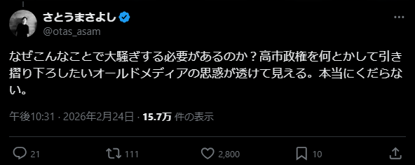 「有権者煽ってるやん」は皮肉で実際に煽ってるとは思ってないんですよね。おそらく♥️押しくれてる方々も「高市は有権者を煽るなんてけしからん」って意味で♥️押してるのではなく419のコメントが意味不明だよねってことだと思う。彼らには皮肉が伝わってると思ってる。俺のコメント自体は高市本人をいっさい攻撃はしてないんで、そういう風に見えてしまったらすみません。