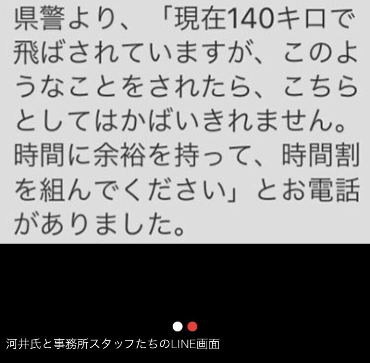 〈河井法相(当時)はイベントのため急いで広島県内を移動中。大臣が運転の秘書に急ぐよう求め、時速80キロ制限の高速道を140キロで走行したと。県警からは「現在140キロで飛ばされていますが、このようなことをされたらかばいきれません。時間に余裕を持って…」と電話が。