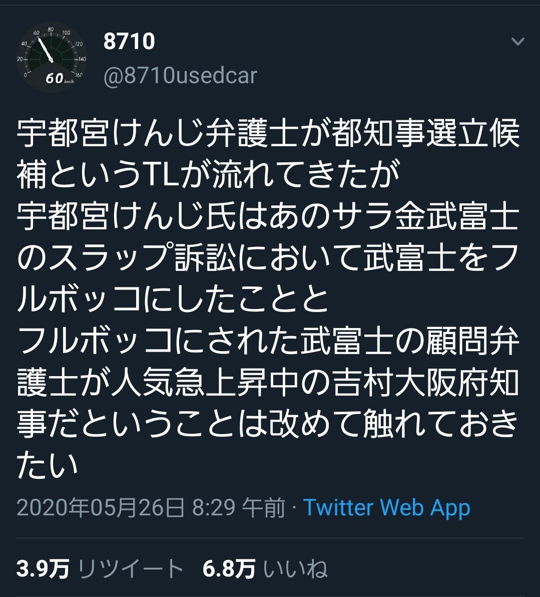 大尊氏立候補で武富士以外にもたかじんの遺産の件とか弁護士時代の吉村のゲス案件掘り起こされてて草なんだ