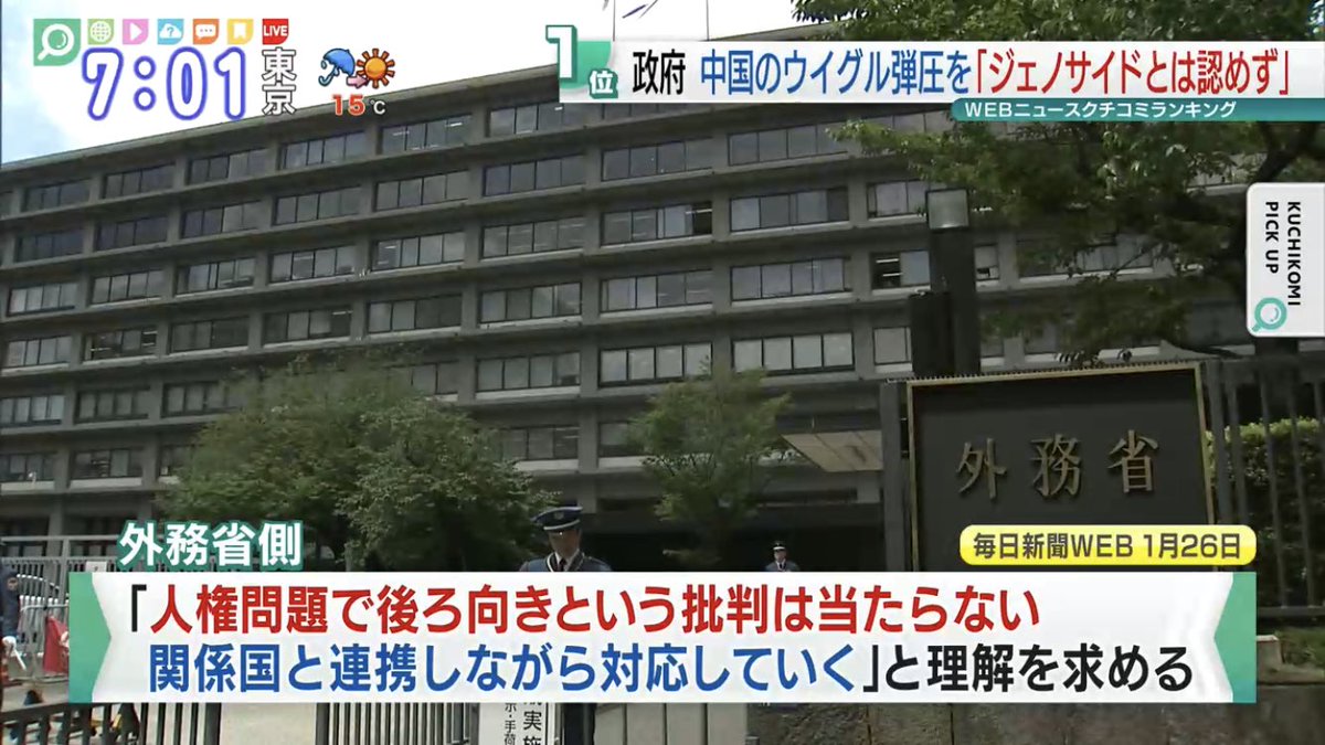 米国務省が中国による新疆ウイグル自治区での行動を「ジェノサイド(大量虐殺)」と認定したことを巡り、外務省の担当者は26日の自民党外交部会で「日本として『ジェノサイド』とは認めていない」との認識を示した。出席した自民党議員からは「日本の姿勢は弱い」などの指摘が相次いだが、外務省側は「人権問題で後ろ向きという批判は当たらない。関係国と連携しながら対応していく」と理解を求めた。