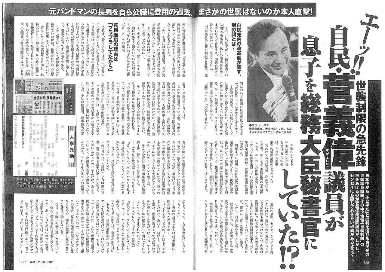 週刊文春によると、第1次安倍内閣で総務相として初入閣した2006年、菅首相は20代半ばの長男を自身の秘書官に起用した。しかし、正剛氏は秘書官生活にうまく適応できず、その後菅首相は自身の後援企業だった東北新社に息子の就職を頼んだ。東北新社の創業者は、菅首相と同じ秋田県出身と知られている。