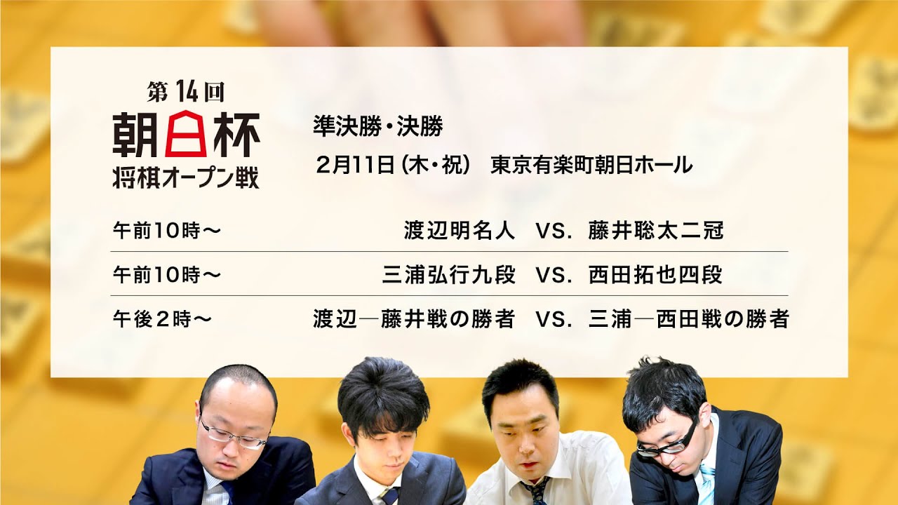 第14回朝日杯将棋オープン戦の準決勝・決勝が2月11日、東京の有楽町朝日ホールで指されます。第6回以来の優勝を目指す渡辺明名人、過去2回優勝の藤井聡太二冠ら4強が対戦します。現地の大盤解説会には木村一基九段、杉本昌隆八段、鈴木環那女流三段、山口恵梨子女流二段が登場します。
