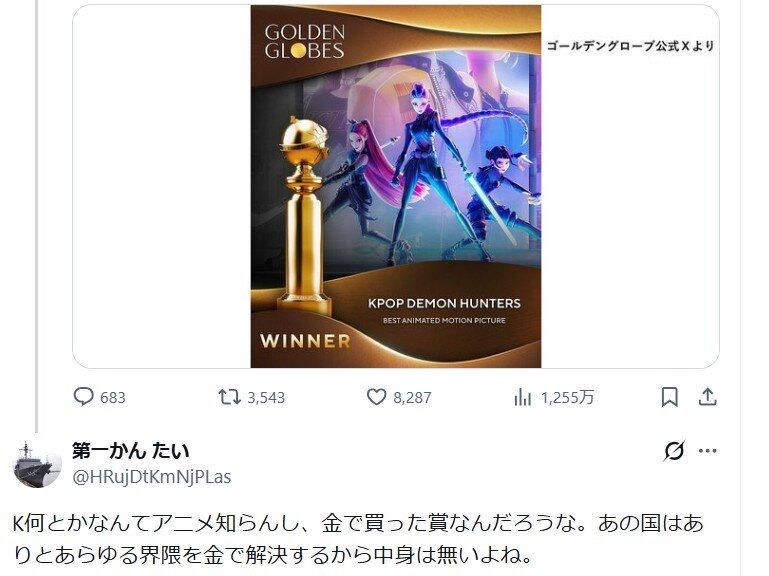 【【アニメ】鬼滅を抑えてゴールデングローブ賞受賞のKPOPガールズにネトウヨブチギレ「韓国の工作だ!賄賂だ!」←ソニー製作なのに】の続きを読む