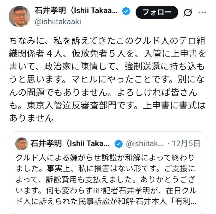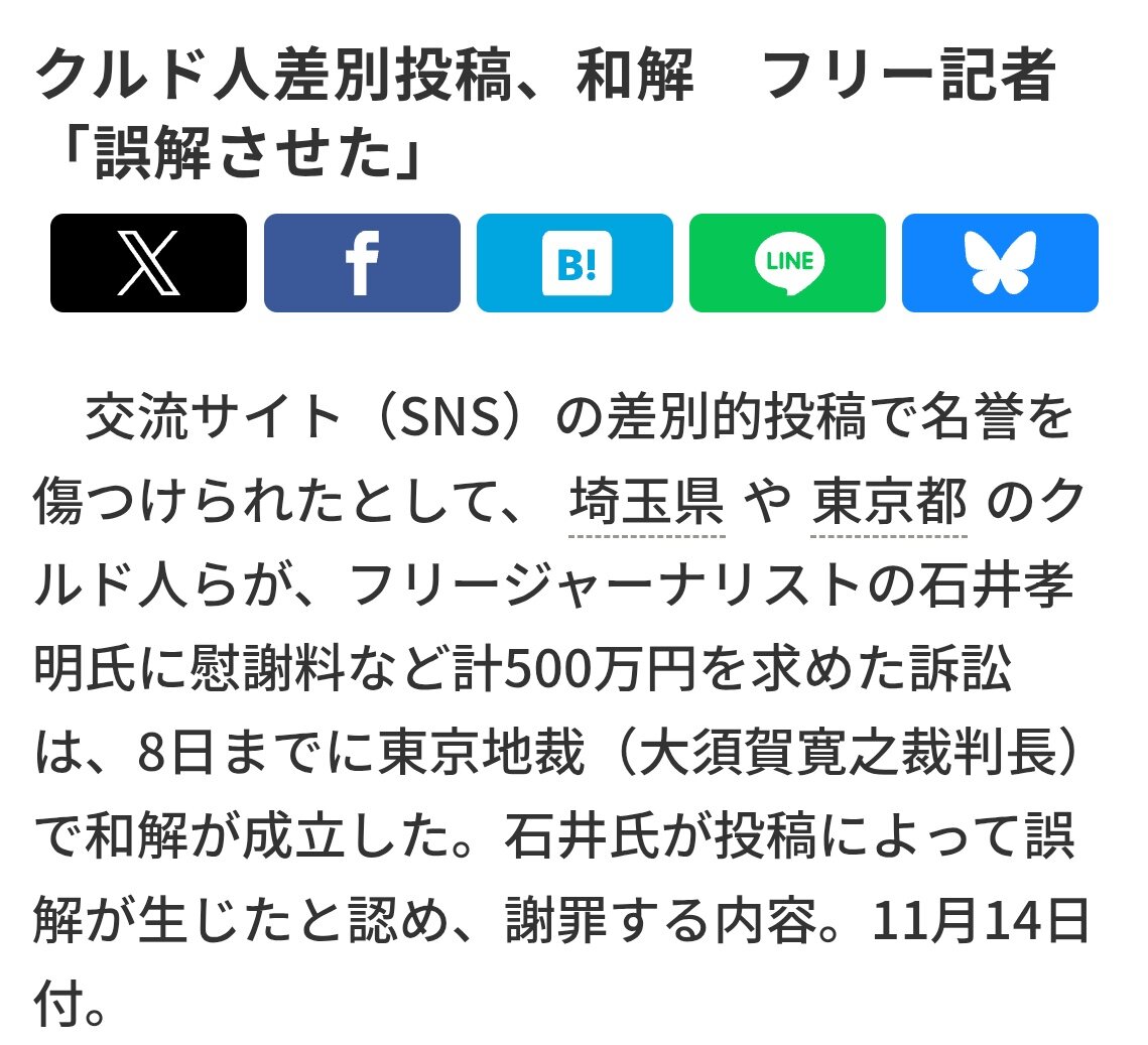 クルド人デマで謝罪することを条件に和解した自称ジャーナリスト石井孝明、案の定イキりだす 2025年12月10日 カテゴリ:民度/モラル 1: それでも動く名無し 2025/12/10(水) 11:00:24.22 ID:AriAZ4Pcd https://www.47news.jp/13566470.html ↓ ※https://www.ben54.jp/news/988原告らが訴えた、石井氏による投稿の具体例は下記のとおり。・複数の原告を名指しでテロリスト関係者と断定する投稿。・クルド人の春の祭り「ネウロズ」をテロリストの集会であるかのように読ませる投稿。・川口市の犯罪増加の原因がクルド人であるかのように読ませる投稿。・「放尿、不潔、争いなど、恥と思わない田舎者」「現代の文明、文字をスマホと車とネットしか知らん」「共生なんてできるわけない」「小学校教育も受けていないエイリアンに見えます」などの罵詈雑言。・「あの羊飼いが元々多い民族が、秩父の河原で山羊を解体して食っているという垂れ込みが多々あります」と真偽不明の情報を拡散。原告らがとくに問題視しているのは、SNSの投稿が原因で、在日クルド人の子どもが学校で同級生から「国に帰れ」と言われるなどのいじめ被害を受けるようになったことだ。クルド人男性と結婚した日本人女性は、学校の放課後に夫の親戚の子どもと一緒にいるところを写真にとられ、「学校にちゃんと通わせていない」と書かれたという。また、会見に参加したクルド人男性は、住所や経営する会社の名称・所在地を拡散される被害を受けた。 引用元:https://nova.5ch.net/test/read.cgi/livegalileo/1765332024/https://asahi.5ch.net/test/read.cgi/newsplus/1765195693/ 【クルド人デマで謝罪することを条件に和解した自称ジャーナリスト石井孝明、案の定イキりだす】の続きを読む タグ :#石井孝明#デマ#裁判#クルド人#香山リカ