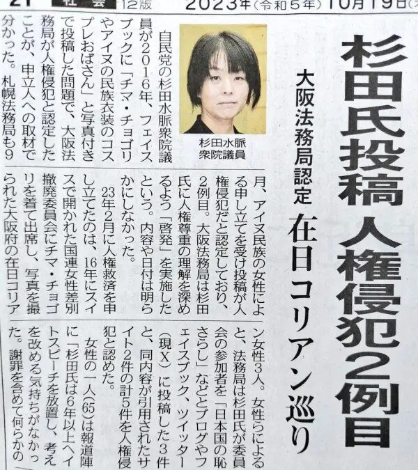 自民党、差別主義者で悪質な誹謗中傷デマを多数発信してきた杉田水脈を大阪5区に擁立! 2026年01月21日 カテゴリ:民度/モラル選挙 1: それでも動く名無し 2026/01/20(火) 18:37:17.95 ID:vVNPRyrB0 はい※https://www.47news.jp/13749582.html 自民党は次期衆院選で、公明党が新党結成に伴い撤退した大阪5区に杉田水脈元衆院議員を擁立する方針を固めた。関係者が20日、明らかにした。大阪5区では当初、日本維新の会を除名された無所属の守島正氏(大阪2区)の擁立を検討。調整の結果、守島氏は2区に回り、自民が推薦する方向となった。 杉田氏は旧安倍派で衆院当選3回。アイヌ民族や在日コリアンらへの差別的言動を繰り返し、法務当局が人権侵犯と認定した。自民派閥裏金事件では党役職停止6カ月の処分を受けた。2024年の衆院選は立候補を見送り、昨年7月の参院選では比例代表で出馬し落選した。引用元:https://nova.5ch.net/test/read.cgi/livegalileo/1768901837/https://nova.5ch.net/test/read.cgi/livegalileo/1768909218/ 【自民党、差別主義者で悪質な誹謗中傷デマを多数発信してきた杉田水脈を大阪5区に擁立!】の続きを読む タグ :#衆院選#杉田水脈#高市早苗#レイシスト#裏金