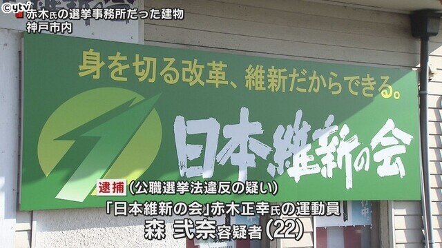 10月31日投開票の衆議院選挙で、「日本維新の会」候補者の運動員が公職選挙法違反容疑で逮捕された事件で、同じ陣営の別の運動員が新たに逮捕された。 逮捕されたのは、衆院選で兵庫4区から出馬、比例選で復活当選した「日本維新の会」の赤木正幸さんの運動員、森弐奈容疑者。