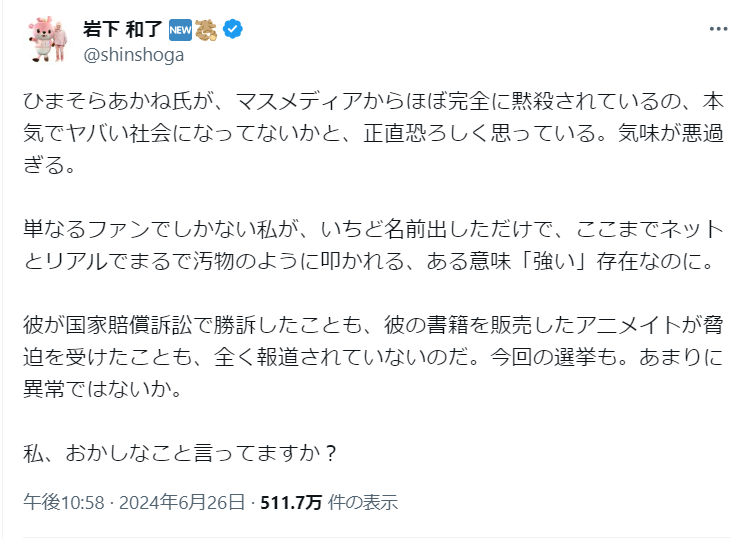 大物社長「ひまそらあかね氏がマスコミに黙殺されている。本気でヤバい社会だ」「彼はたった一人で社会の闇と戦ってきたんですよ!」 2024年07月06日 カテゴリ:陰謀論 1: それでも動く名無し 警備員[Lv.5] 2024/06/29(土) 13:35:32.03 ID:NXtAZiSb0NIKU https://twitter.com/shinshoga/status/1805963774513545658 引用元:https://nova.5ch.net/test/read.cgi/livegalileo/1719635732/ 【大物社長「ひまそらあかね氏がマスコミに黙殺されている。本気でヤバい社会だ」「彼はたった一人で社会の闇と戦ってきたんですよ!」】の続きを読む タグ :#都知事選#東京都知事選挙#陰謀論#妄想#情報リテラシー#岩下の新生姜#謎理論#誹謗中傷