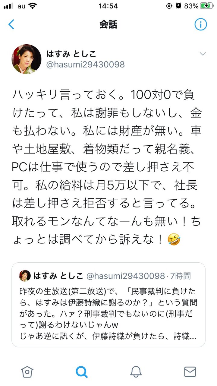 ハッキリ言っておく。100対0で負けたって、私は謝罪もしないし、金も払わない。私には財産が無い。車や土地屋敷、着物類だって親名義、PCは仕事で使うので差し押さえ不可。私の給料は月5万以下で、社長は差し押さえ拒否すると言ってる。取れるモンなんてなーんも無い!ちょっとは調べてから訴えな!🤣