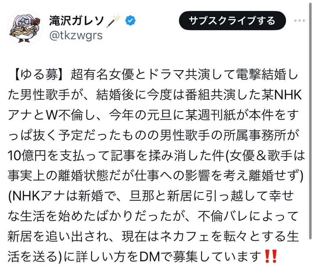 アミューズ法務部、滝沢ガレソのデマに対し声明発表「法的措置を含む対応を検討」 2024年05月23日 カテゴリ:芸能 1: それでも動く名無し 警備員[Lv.3][新] 2024/05/23(木) 07:39:19.93 ID:AZCKzXk10 たいへんだぁ ※ 引用元:https://nova.5ch.net/test/read.cgi/livegalileo/1716417559/ 【アミューズ法務部、滝沢ガレソのデマに対し声明発表「法的措置を含む対応を検討」】の続きを読む タグ :#滝沢ガレソ#デマ#アミューズ#星野源#新垣結衣