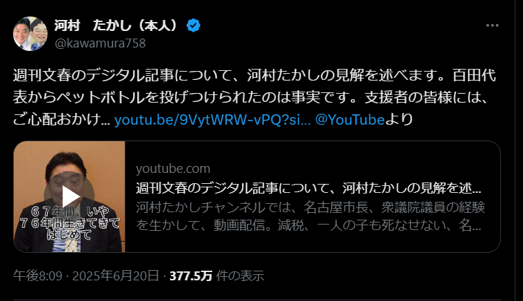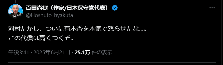 【激闘】日本保守党さん、百田尚樹と河村たかしの内紛でもうボロボロ 2025年06月24日 カテゴリ:愛国 15: 名無しさん@おーぷん 25/06/21(土) 19:51:41 ID:B4qp ウヨおじ特有の内ゲバ※(動画)https://video.twimg.com/amplify_video/1937415628874526720/vid/avc1/1280x720/NF5GNlShHSOGTqSe.mp4百田(嫌味で手にペットボトルを持ちながら)「河村さんは僕らとやる気あるのかかなぁと思いますけどね。しばらく、僕河村さんと会話してないですけど、河村さんの最近あげてる動画とか、あのタイミングではもう、まぁ普通に客観的に見た場合反党行為だなという感じはしますよね」引用元:https://hayabusa.open2ch.net/test/read.cgi/livejupiter/1750502672/ 【【激闘】日本保守党さん、百田尚樹と河村たかしの内紛でもうボロボロ】の続きを読む タグ :#百田尚樹#河村たかし#有本香#井川意高#日本保守党#減税日本#都議選#参院選#ウヨゲバ#愛国