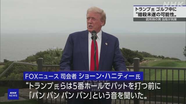 米捜査当局は15日、フロリダ州パームピーチ郡のゴルフ場でプレーしていたドナルド・トランプ前大統領を銃撃しようとした疑いで、男を拘束したと発表した。トランプ前大統領は「安全で無事だ」と支持者へのメールで書いた。カマラ・ハリス副大統領は、トランプ前大統領の無事を喜ぶとともに、暴力を非難する声明を出した。