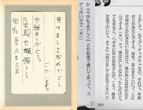 「それで、年賀状とか来たんですよ、毎年。あんまりこいつ、人に年賀状とか出さないんだけど、僕のところには何か出すんですよ(笑)。で、僕は出してなかったんだけど、でも来ると、ハガキに何かお母さんが、こう、線を定規で引いて、、そこに「明けましておめでとう」とか「今年もよろしく」とか鉛筆で書いてあって、スゲェ汚い字で(笑)。」(P.57-58)
