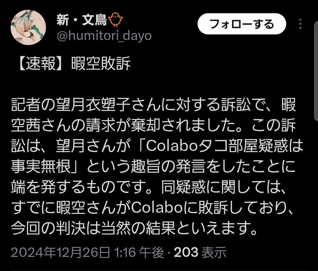 暇空茜、また敗訴 望月衣塑子記者に 2024年12月26日 カテゴリ:訴訟/裁判 1: それでも動く名無し 2024/12/26(木) 13:39:19.40 ID:KSiNRhSc0 2: それでも動く名無し 2024/12/26(木) 13:39:29.16 ID:KSiNRhSc0 https://twitter.com/humitori_dayo/status/1872134258200035333 引用元:https://nova.5ch.net/test/read.cgi/livegalileo/1735187959/ 【暇空茜、また敗訴 望月衣塑子記者に】の続きを読む タグ :#リーバルバトル#ナニカグループ#暇空茜#望月衣塑子#Colabo#タコ部屋#暇空敗訴
