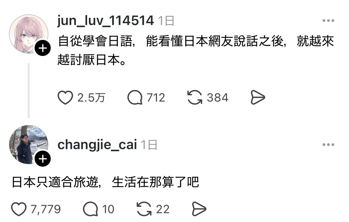 【悲報】台湾人「日本語を学ぶほど日本が嫌いになってきた。」→2.5万いいね 2025年08月22日 カテゴリ:台湾 1: それでも動く名無し 2025/08/22(金) 16:05:55.79 ID:8l1guIcx0 日本語を勉強して、日本人のネットでの会話が理解できるようになってから、日本のことがだんだん嫌いになってきた。 ↓ 日本は旅行するにはいいけど、暮らすのはやめておいた方がいいね。 引用元:https://nova.5ch.net/test/read.cgi/livegalileo/1755846355/ 【【悲報】台湾人「日本語を学ぶほど日本が嫌いになってきた。」→2.5万いいね】の続きを読む タグ :#台湾#日本#ネット#排外主義