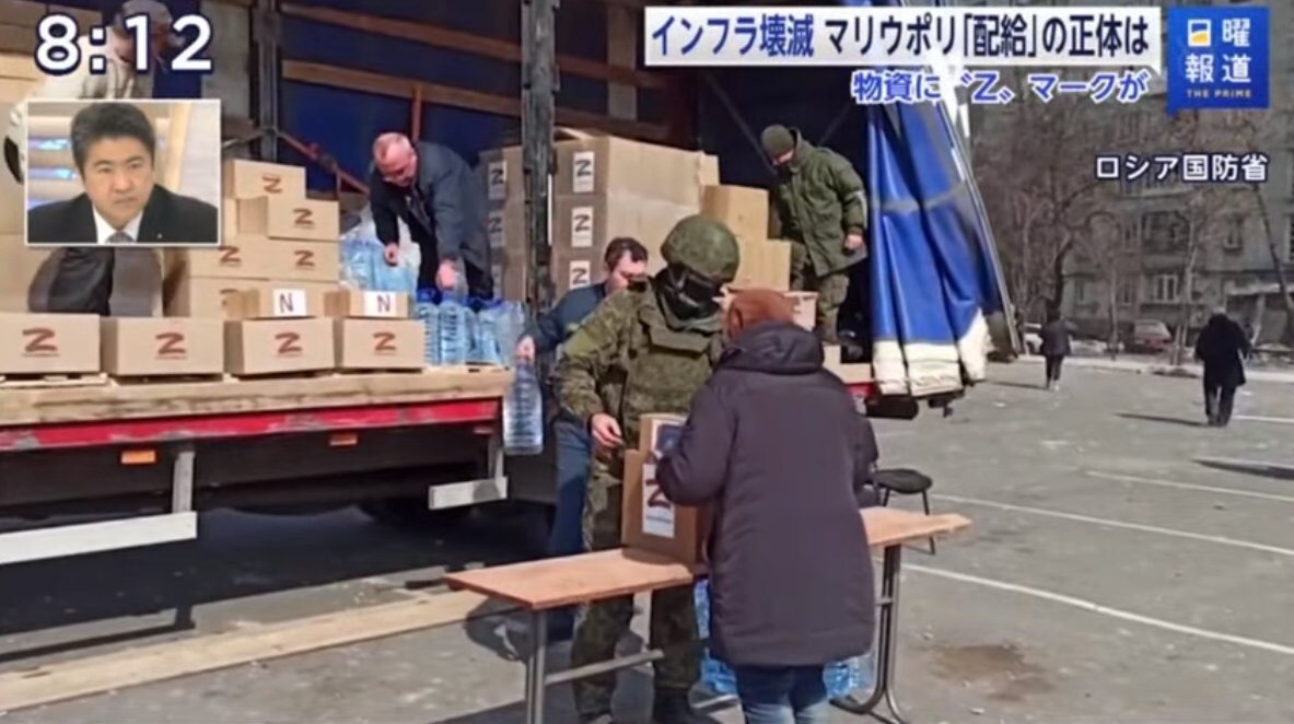 水、食料を受け取った人の段ボールをみると、ロシア軍を示すZのマークがしるされている。これはロシア国防省が公開した映像。