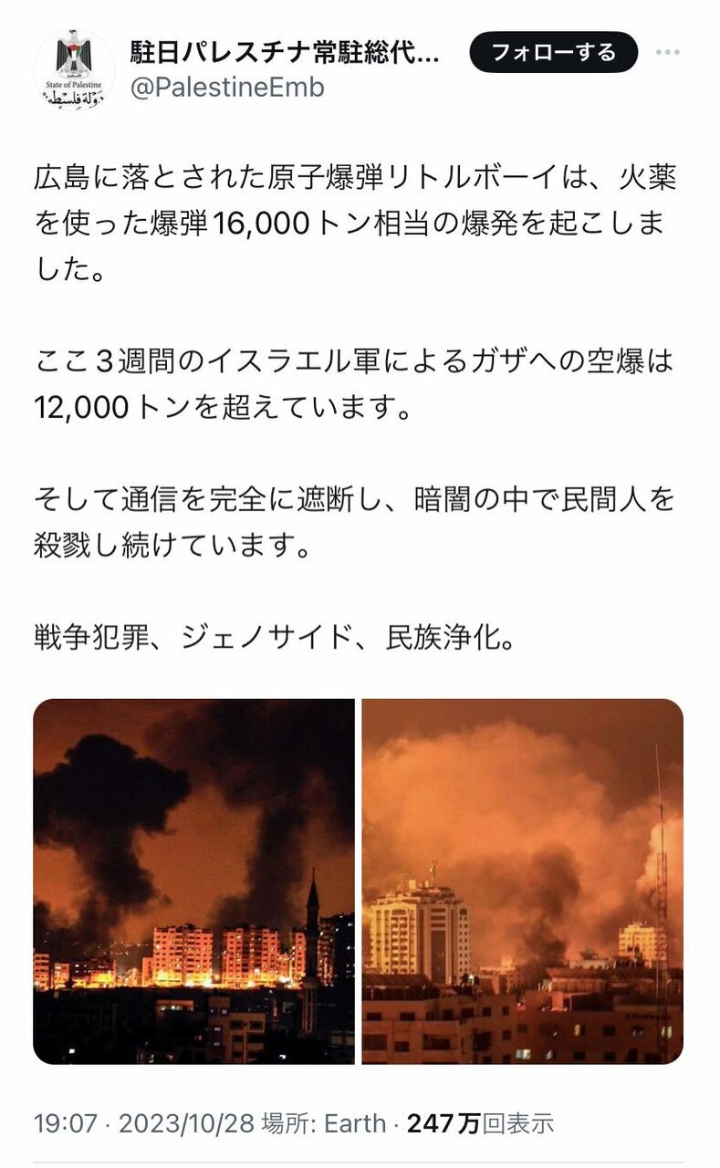 【駐日パレスチナ代表「イスラエルの爆撃は原爆並み」→ネット民「先に手を出したのはそちら」「一緒にするな」「不愉快だ」】の続きを読む