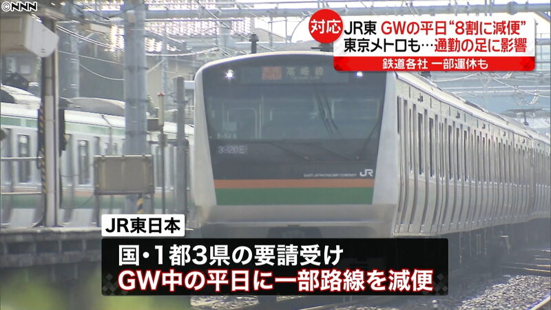 JR東日本によりますと、国や東京都など1都3県から人の流れの抑制のため減便などを要請されたことを受け、ゴールデンウイーク期間中の平日に一部路線で減便を行うと発表しました。