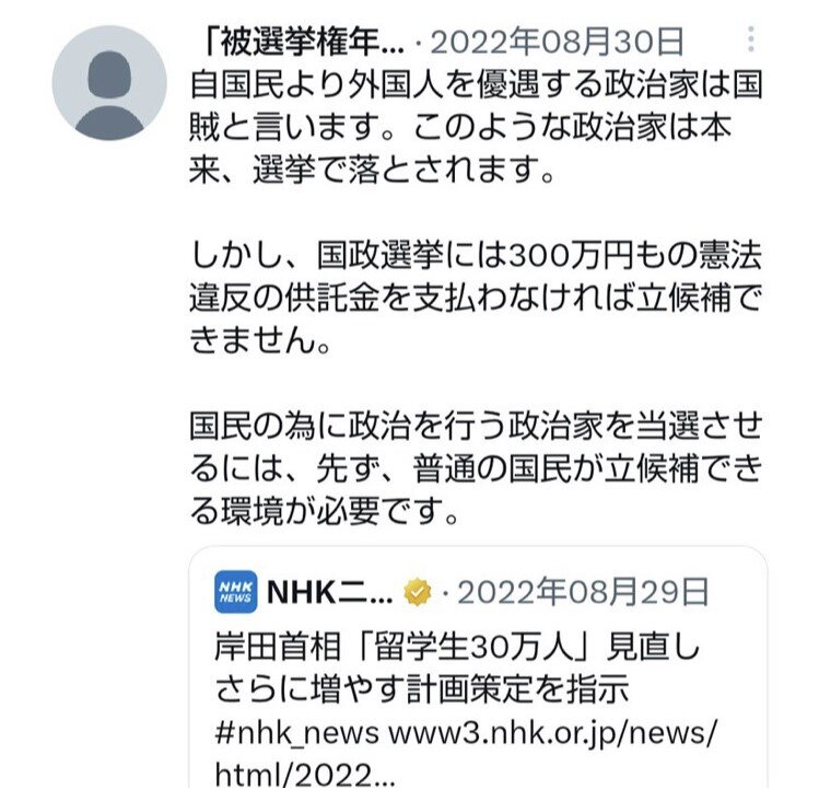 木村容疑者、本人らしきツイ垢などが見つかる・・・ 2023年04月19日 カテゴリ:事件 1: それでも動く名無し 2023/04/19(水) 13:00:26.61 ID:+uhxaNVz0 あっ(察し)🥺 https://bunshun.jp/denshiban/articles/b5771 ※▶中学時代の愛読書は「永遠の0」「涼宮ハルヒ」・愛読書が百田尚樹・反外国人・反岸田・自民党の政治家へ訴え・ウツケンを呼べ・反統一教会・国葬反対・選挙制度裁判https://news.yahoo.co.jp/articles/988f81dc1fe2a9fff0fbb486a611841d2d9fba93岸田首相の選挙演説会場に爆発物が投げ込まれた事件で、逮捕された無職木村隆二容疑者(24)のものとみられるツイッターは、国を提訴した直後の昨年6月27日に始まり、事件4日前の今年4月11日まで23件の投稿があった。アカウント名は「『被選挙権年齢・選挙供託金違憲訴訟』広報」で、訴訟の報告や選挙制度への批判が中心だった。 引用元:https://nova.5ch.net/test/read.cgi/livegalileo/1681876826/https://nova.5ch.net/test/read.cgi/livegalileo/1681788187/ 【木村容疑者、本人らしきツイ垢などが見つかる・・・】の続きを読む タグ :#被選挙権#供託金