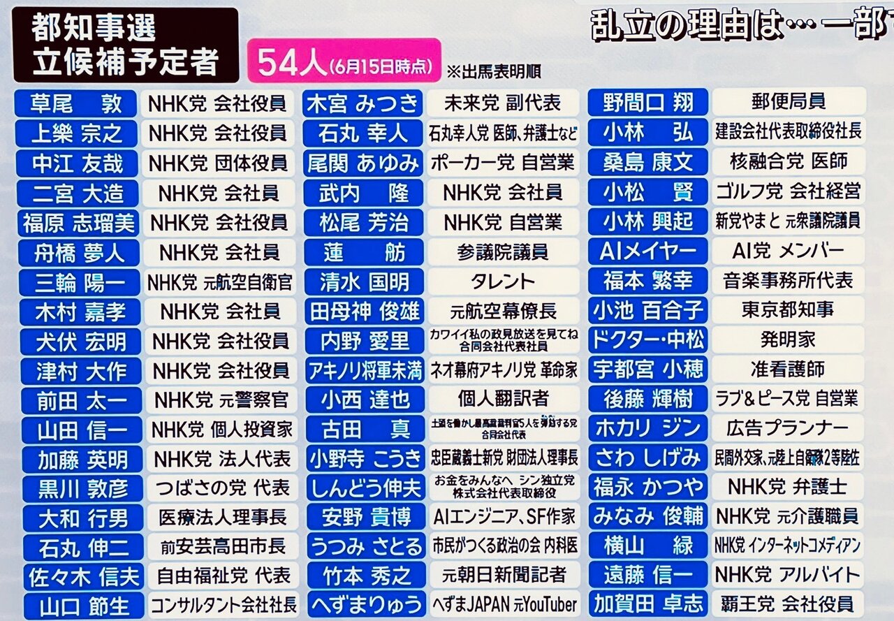 東京都知事選、現在候補者54人wwww 2024年06月17日 カテゴリ:東京泡沫 1: それでも動く名無し 警備員[Lv.6] 2024/06/16(日) 11:05:24.21 ID:ypD+Eul70 だれにする? 引用元:https://nova.5ch.net/test/read.cgi/livegalileo/1718503524/ 【東京都知事選、現在候補者54人wwww】の続きを読む タグ :#都知事選#乱立#供託金#アキノリ将軍未満#泡沫#AIメイヤー#政見放送#核融合党#覇王党#NHK党
