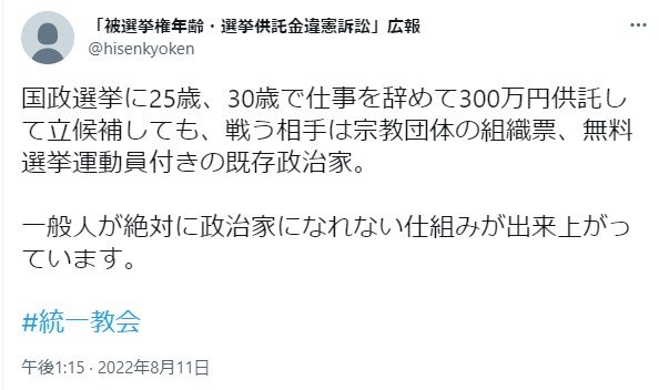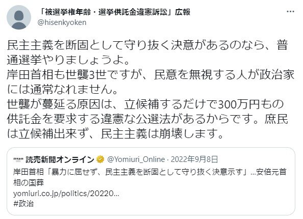 木村「年齢で選挙に出れないのはおかしい」 大串議員「選挙活動を応援してくれる友達おるんか?」 木村「」 2023年04月20日 カテゴリ:選挙 1: それでも動く名無し 2023/04/19(水) 17:06:03.15 ID:SIXfJibGM 大串氏は制度について「(国民の)一定の合意が得られているのでは」と応じたが、木村容疑者は「年齢は関係ない」と反論し、「憲法違反」との主張を繰り返したという。 大串氏は報告会の前後計約20分間にわたって応対した。その中で「選挙で応援してくれる友達はいるのか」と尋ねると、木村容疑者は無言になったという。 https://www.yomiuri.co.jp/national/20230419-OYT1T50061/ 岸田首相の選挙演説会場に爆発物が投げ込まれた事件で、威力業務妨害容疑で逮捕された木村隆二容疑者(24)が選挙制度に不満を抱き、改正に強い執着を持っていたことが明らかになってきている。事件を起こすことで、その目的を果たそうとしたのか。「被選挙権が25歳からなので市議選に出られない。法改正してほしい」 木村容疑者は昨年9月、地元・兵庫県川西市の自民党系市議(当時)が開いた市政報告会に参加し、出席した同党の大串正樹衆院議員にそう訴えていた。公職選挙法は被選挙権について、衆院議員や地方議員、市区町村長は25歳以上、参院議員と都道府県知事は30歳以上と定める。「社会経験に基づき、思慮分別ができる能力を踏まえた」(総務省)ためだが、23歳だった木村容疑者はいずれも満たしていなかった。 引用元:https://nova.5ch.net/test/read.cgi/livegalileo/1681891563/ 【木村「年齢で選挙に出れないのはおかしい」 大串議員「選挙活動を応援してくれる友達おるんか?」 木村「」】の続きを読む タグ :#公職選挙法#被選挙権#選挙スタッフ#ボランティア#供託金