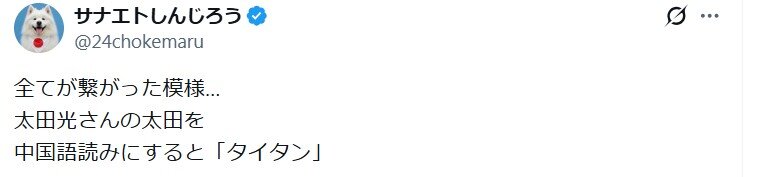 ネトウヨ「太田光の太田を中国語読みしたら『タイタン』全ては繋がりました!」大バズリ → 実際は『タイティェン』日本語の音読みの方が近い 2026年02月19日 カテゴリ:愛国 1: それでも動く名無し 2026/02/17(火) 20:14:30.28 ID:K2zIQtqt0 82: それでも動く名無し 2026/02/17(火) 21:16:34.20 ID:pRWKGllk0tàitiánはタイティエンやぞ×××引用元:https://nova.5ch.net/test/read.cgi/livegalileo/1771326870/ 【ネトウヨ「太田光の太田を中国語読みしたら『タイタン』全ては繋がりました!」大バズリ → 実際は『タイティェン』日本語の音読みの方が近い】の続きを読む タグ :#高市早苗#公約#太田光#タイタン#爆笑問題#タイタンの妖女