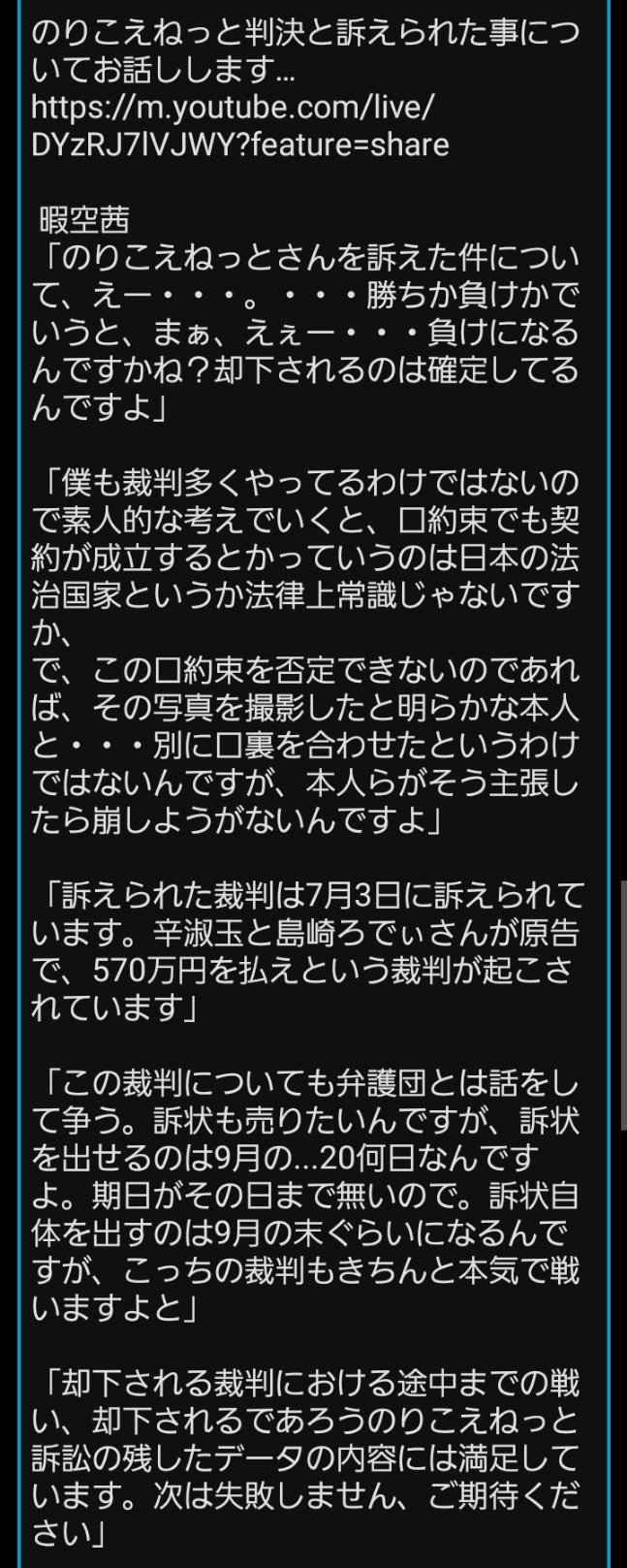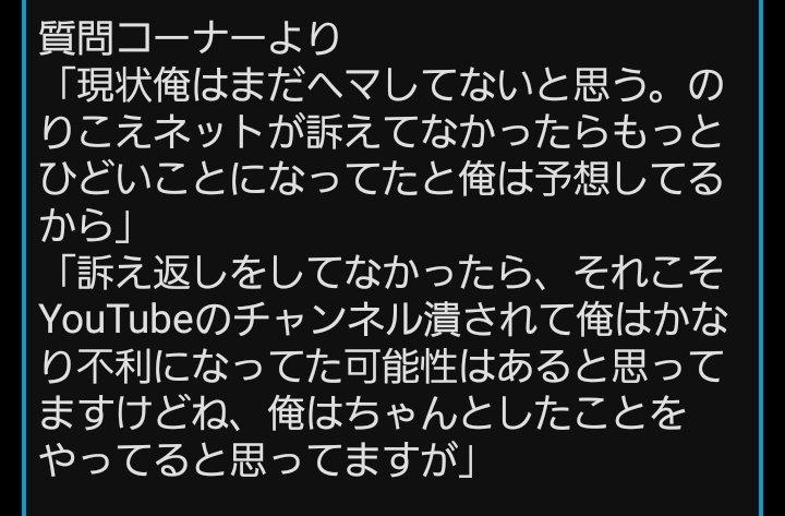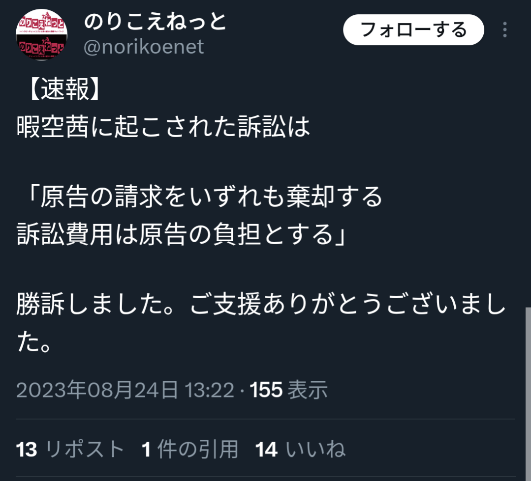 【速報】暇空、のりこえねっとに敗訴wwwww 2023年08月24日 カテゴリ:訴訟/裁判ネット 1: それでも動く名無し 2023/08/24(木) 13:33:10.56 ID:GIPdk2op0 はい【速 報】『暇空敗訴‼︎』この後、報告会で詳しくお話しします。https://t.co/TtWNvK8gDB pic.twitter.com/RIA9oekWWh— のりこえねっと (@norikoenet) August 24, 2023 引用元:https://nova.5ch.net/test/read.cgi/livegalileo/1692851590/ 【【速報】暇空、のりこえねっとに敗訴wwwww】の続きを読む タグ :#裁判#判決#のりこえねっと#暇空茜#司法#リーガルバトル#暇アノン#ナニカグループ#WBPC#暇空敗訴
