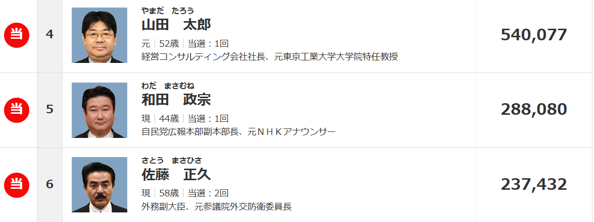 和田政宗は2019年比例3位なのにそこから15位以下の落差はエグすぎやろ…クルドとか言われて支持者が離れたのもあるが