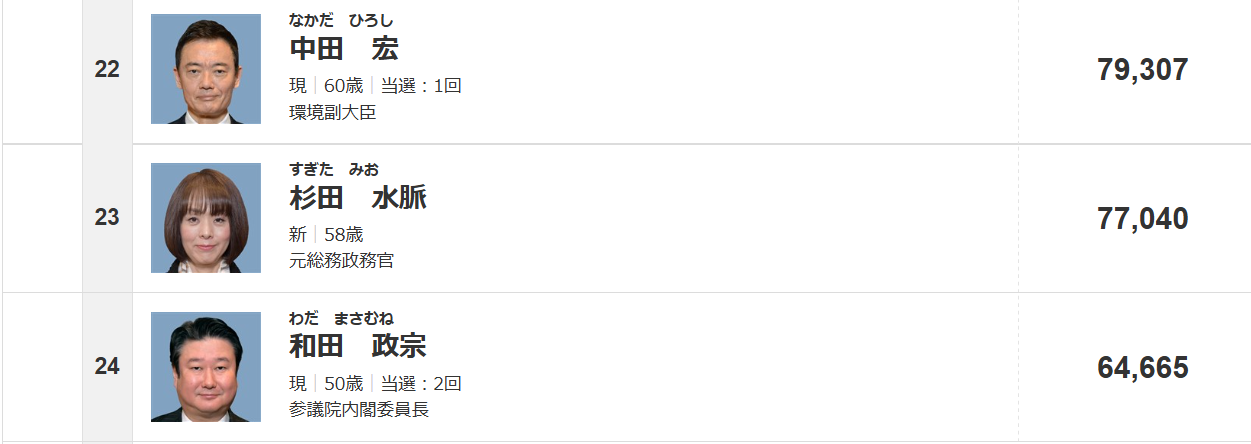 前回比例上位の和田政宗、同じく保守層に人気の杉田水脈、中田宏ガッツリ落ちて完全に当選圏外なの草