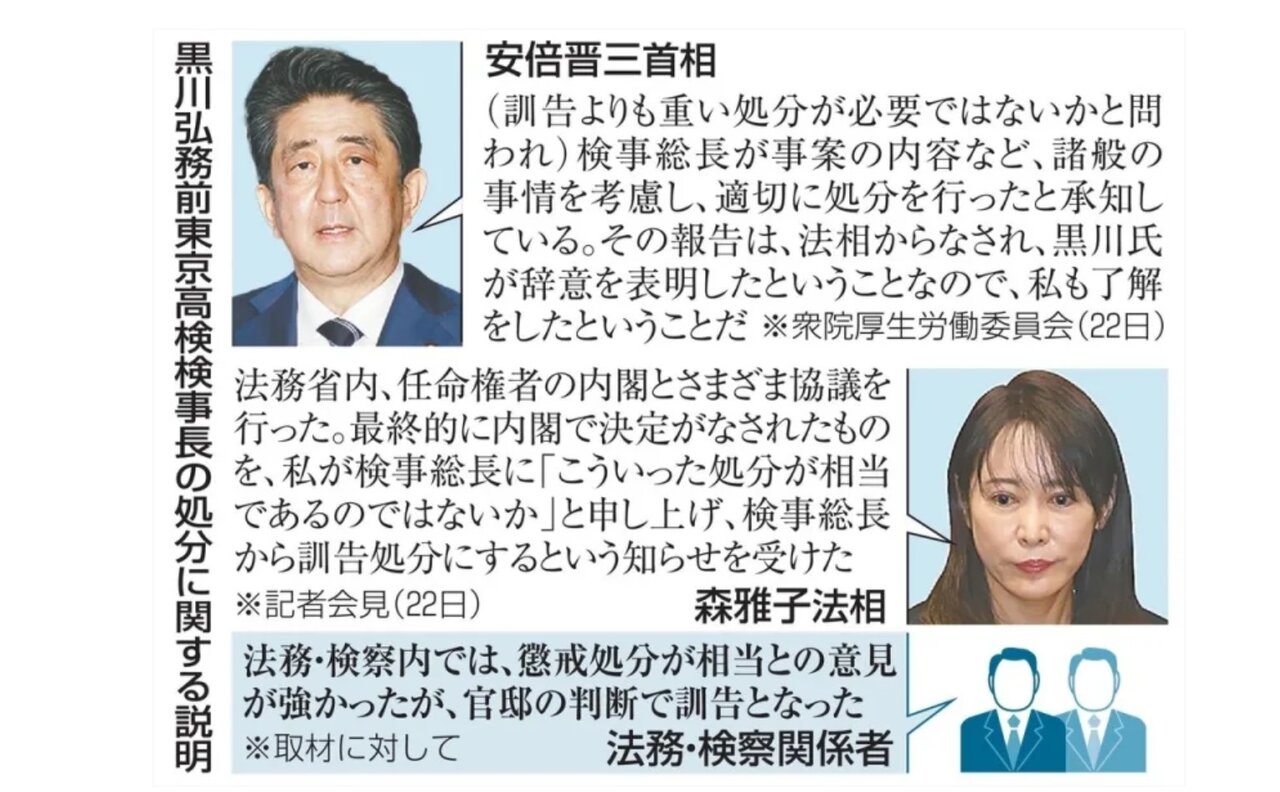 辞職した黒川弘務前東京高検検事長(63)の処分を巡り、事実関係を調査した法務省は、国家公務員法に基づく懲戒が相当と判断していたが、