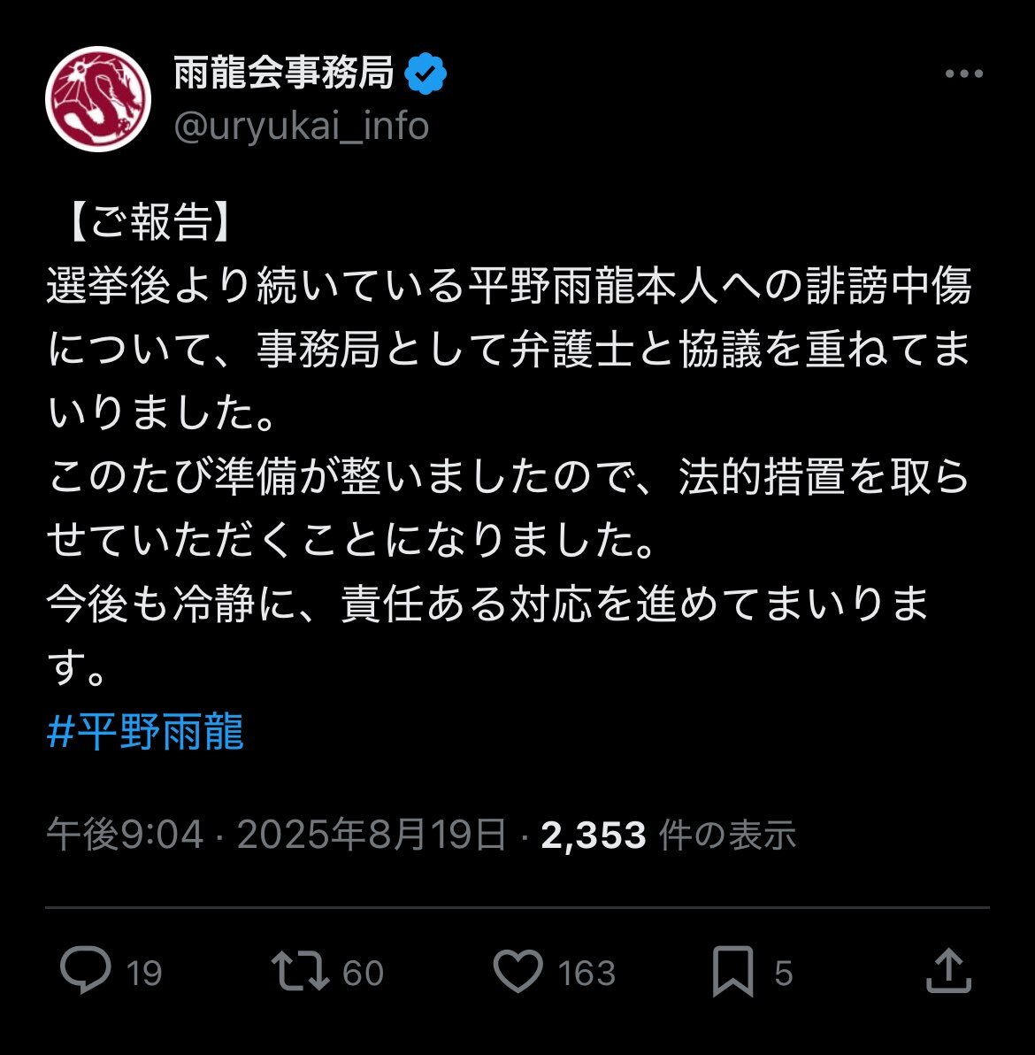 平野雨龍、ついに法的措置へ 暇空氏🥸イライラが止まらない 2025年08月21日 カテゴリ:YouTuber/インフルエンサー 1: それでも動く名無し 2025/08/20(水) 17:04:59.17 ID:RiGkapPt0 (画像1) https://i.imgur.com/BLv1rNg.jpeg (画像2)https://i.imgur.com/cnDWRax.jpeg (画像3)https://i.imgur.com/81NO8x0.jpeg 【平野雨龍、ついに法的措置へ 暇空氏🥸イライラが止まらない】の続きを読む タグ :#平野雨龍#愛国#国籍透視#バトル