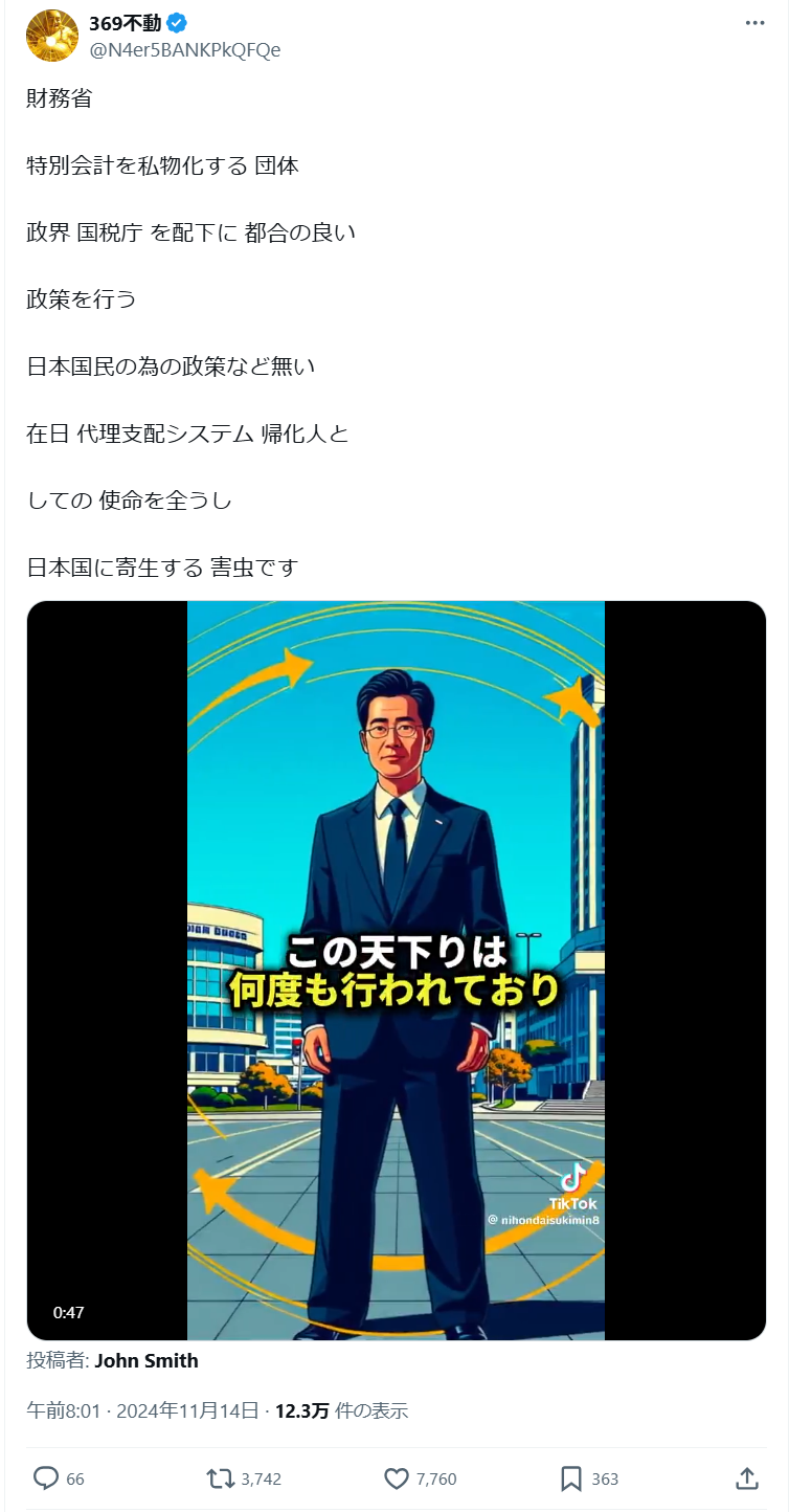 【真実に目覚めた人「財務省は在日の帰化人集団だ!」 →7700いいね】の続きを読む