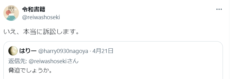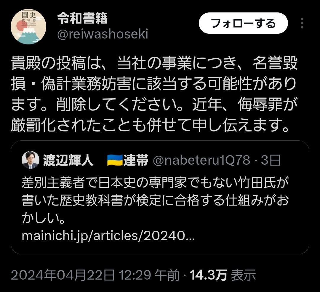反社会的な差別行為を繰り返してきた竹田恒泰の出版社・令和書籍さん、「差別主義者」呼ばわりしてきた相手を提訴へ! 2024年04月27日 カテゴリ:カルト 1: それでも動く名無し 警備員[Lv.9][新][苗][芽] 2024/04/24(水) 12:22:12.13 ID:lALGoqQA0 差別主義者と言われブチギレ 引用元:https://nova.5ch.net/test/read.cgi/livegalileo/1713928932/ 【反社会的な差別行為を繰り返してきた竹田恒泰の出版社・令和書籍さん、「差別主義者」呼ばわりしてきた相手を提訴へ!】の続きを読む タグ :#教科書#令和書籍#裁判#竹田恒泰#貴殿#散華#議論#差別主義者#モラル#侮辱罪