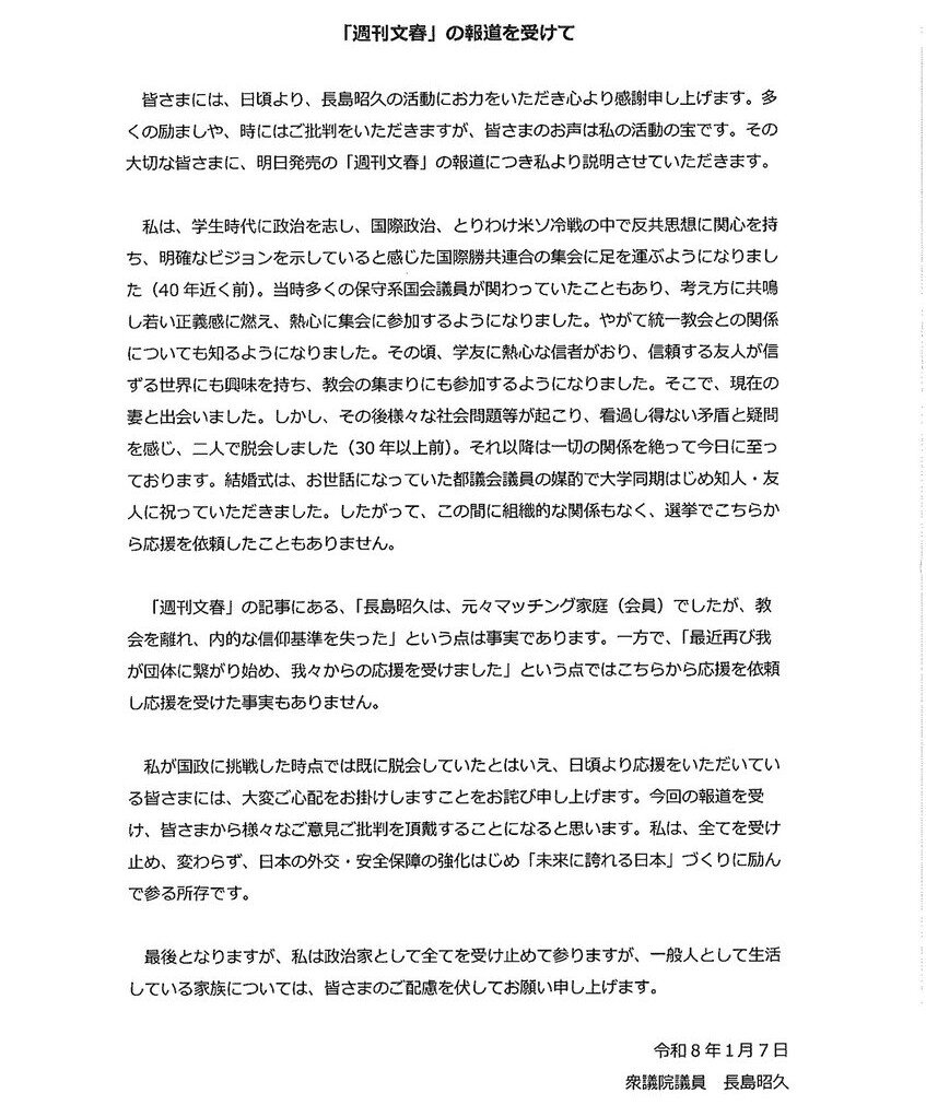 【「週刊文春」報道を受けて】明日発売の「週刊文春」の報道(早版)につきまして、40年近く前の学生時代のこととはいえ、多くの皆さまにご心配をお掛けしてしまい申し訳ない思いでいっぱいです。政治家としての説明責任を果たす意味から、以下に事実関係を認めましたので、どうぞご一読ください。