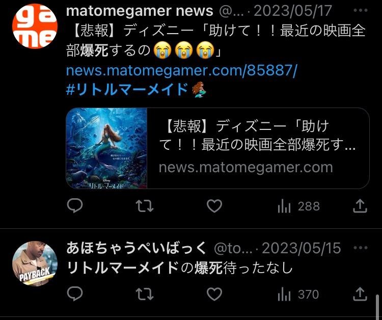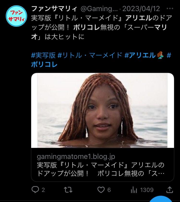 世界中のアンチポリコレ民に叩かれまくった実写版「リトル・マーメイド」、普通にメガヒット 2023年06月03日 カテゴリ:映画/ドラマ 1: それでも動く名無し 2023/05/31(水) 13:18:47.55 ID:Y+PZ2Tl6M 4日の売上 評論家の評価🍅と観客評価🍿https://i.imgur.com/HGEkH8w.jpeg https://toyokeizai.net/articles/-/619134批判は今に始まったことではない。2019年世界中で愛されるアリエルの役をベイリーが演じることが発表されて以来、彼女は世界中で巻き起こる匿名の投稿者による、そしてしばしば人種差別的なネット上の「荒らし」による毒に対処してきた。彼女は非常に才能のある女優であり、歌手でもある。人気テレビ番組『グロウニッシュ(Grown-ish)』のレギュラーとして活躍し、姉と人気音楽デュオ『Chloe x Halle』を結成し、歌手としても活動している。しかし、ベイリーの演技力と圧倒的な歌唱力にもかかわらず、アリエル役に起用されたことで、多くの人が怒り、困惑している。中には黒人が白人の人魚姫を演じることはあり得ないと訴える人もいる(人魚は実在しないし、人間でもないので、彼女の人種は関係ないはずだが)。 引用元:https://nova.5ch.net/test/read.cgi/livegalileo/1685506727/ 【世界中のアンチポリコレ民に叩かれまくった実写版「リトル・マーメイド」、普通にメガヒット】の続きを読む タグ :#リトル・マーメイド#ディズニー#映画#マリオ