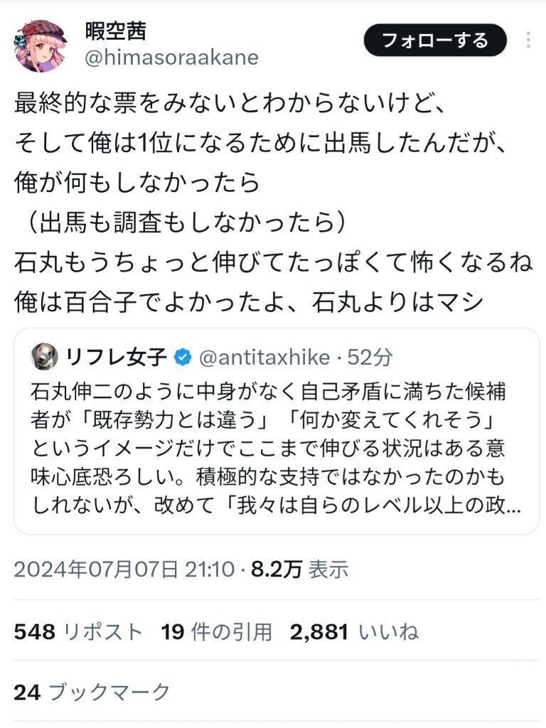 暇空茜「俺が何もしてなかったら、石丸伸二はもっと票伸びてて怖かったと思う」 2024年07月07日 カテゴリ:YouTuber/インフルエンサー 1: それでも動く名無し 警備員[Lv.12] 2024/07/07(日) 21:20:15.19 ID:Dkb6pVmp00707 引用元:https://nova.5ch.net/test/read.cgi/livegalileo/1720354815/https://hayabusa.open2ch.net/test/read.cgi/livejupiter/1720350129/ 【暇空茜「俺が何もしてなかったら、石丸伸二はもっと票伸びてて怖かったと思う」】の続きを読む タグ :#都知事選#東京都知事選挙#東京都知事選挙2024#暇空茜#ひまそらあかね#石丸伸二
