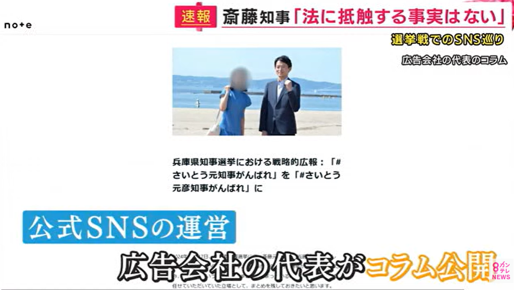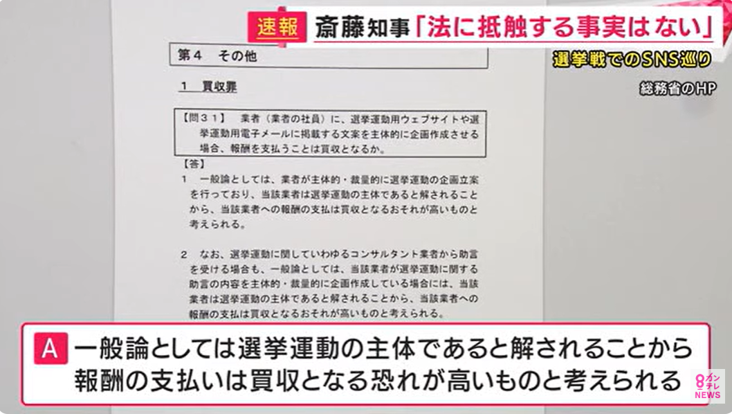 斎藤知事のSNS選挙「広告会社に金銭支払い」と陣営 斎藤知事代理人は違法性を否定 2024年11月22日 カテゴリ:ネット関西 8: それでも動く名無し 警備員[Lv.14] 2024/11/22(金) 15:34:00.54 ID:y2Ua3JWd0 100ワニの時と同じでネット民が流行を作ったつもりになってるものの大部分は広告ってだけだよな※https://news.yahoo.co.jp/articles/8b1cc39e8658412bb27bb1449eed76c4a63820bf再選を果たした兵庫県の斎藤知事が22日釈明に追われたのは、インターネットでの選挙運動についてです。20日、兵庫県知事選挙で、斎藤知事の公式SNSの運営に携わったという広告会社の代表が、ネット上にコラムを公開。そこには、Xやインスタグラムなどを「監修者として、運用戦略立案やアカウントの立ち上げ、ファクトチェック体制の強化などを責任を持って行った」と記されています。22日午前、斎藤陣営の1人に、関西テレビが取材すると、「広告会社に金銭の支払いはある」と話しました。ただ、総務省のHPでは「業者に、選挙運動用ウェブサイトに掲載する文案を主体的に企画作成させる場合、報酬を支払うことは買収となるか」というQ&Aで、「一般論としては、選挙運動の主体であると解されることから、報酬の支払いは買収となる恐れが高いものと考えられる」と回答しています。斎藤知事の代理人弁護士は「SNS戦略の企画立案などについて依頼をしたというのは事実ではありません。あくまでポスター制作等法で認められたものであり相当な対価をお支払いしております。公職選挙法に抵触する事実はございません」とコメントしました。引用元:https://nova.5ch.net/test/read.cgi/livegalileo/1732256508/ 【斎藤知事のSNS選挙「広告会社に金銭支払い」と陣営 斎藤知事代理人は違法性を否定】の続きを読む タグ :#斎藤元彦#兵庫県知事選#選挙運動#公職選挙法#広告会社#演出#総務省#利害関係#柿沢未途